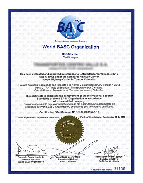 El certificado BASC, es emitido por la sede central de Word BASC Organization y es tramitado por cada uno de los capítulos BASC miembros de la organización los cuales están autorizados para llevar a cabo el proceso de auditoría y certificación de acuerdo a las políticas de WBO y se renueva anualmente conforme a las disposiciones establecidas.